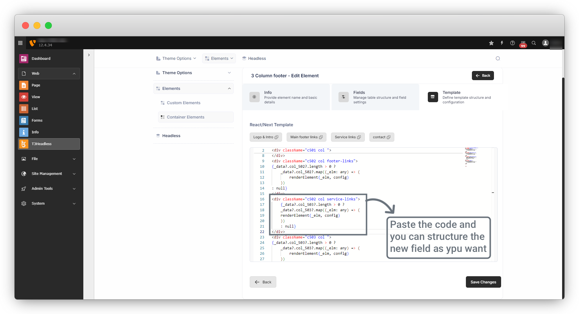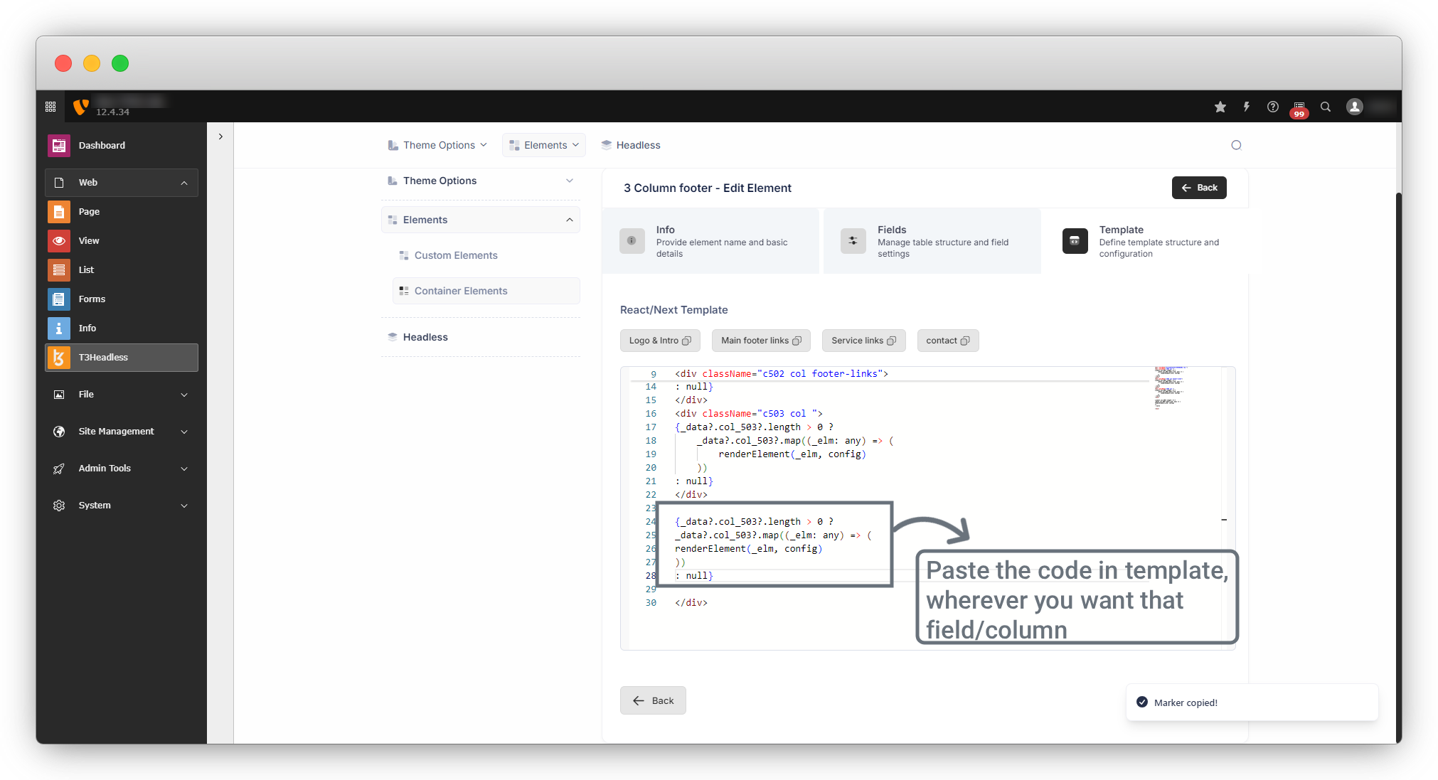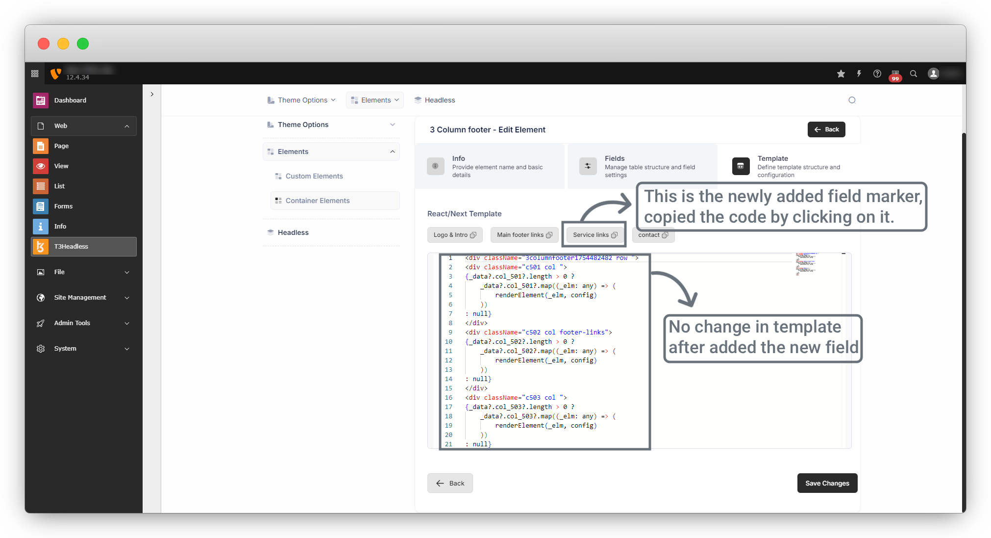 4. Here one important thing to note is; that if you have done your templating already and now you want to add a new field in your element, then you can add the field easily by edit the element, and it will not affect your template. But after adding a new field when you press on the “Next” button you will see that your template is as it is, but you will get a marker for the new field, you can copy the new field code by clicking on that marker and can paste in your template. Below is an example of template editing: