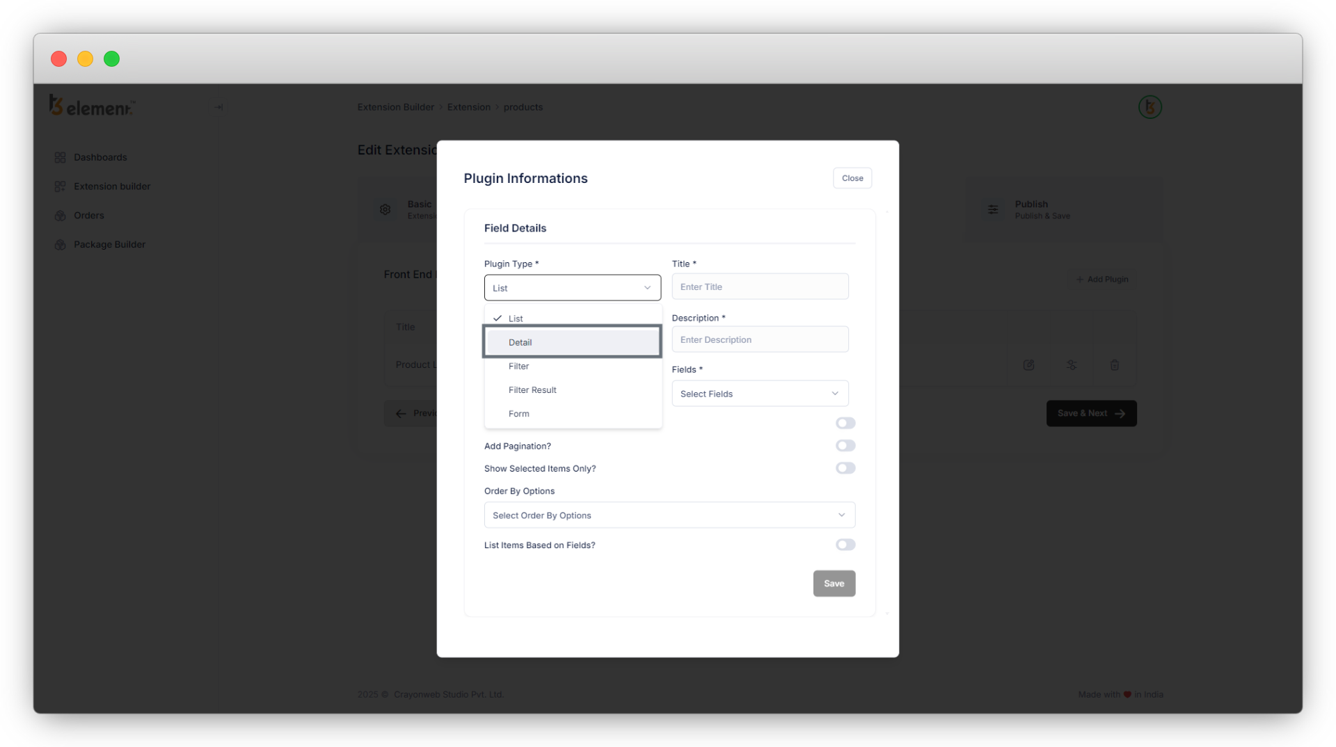 1. Click on the “Add Plugin” button, the default selected plugin will be “List”. Select “Detail” there to create the detail plugin