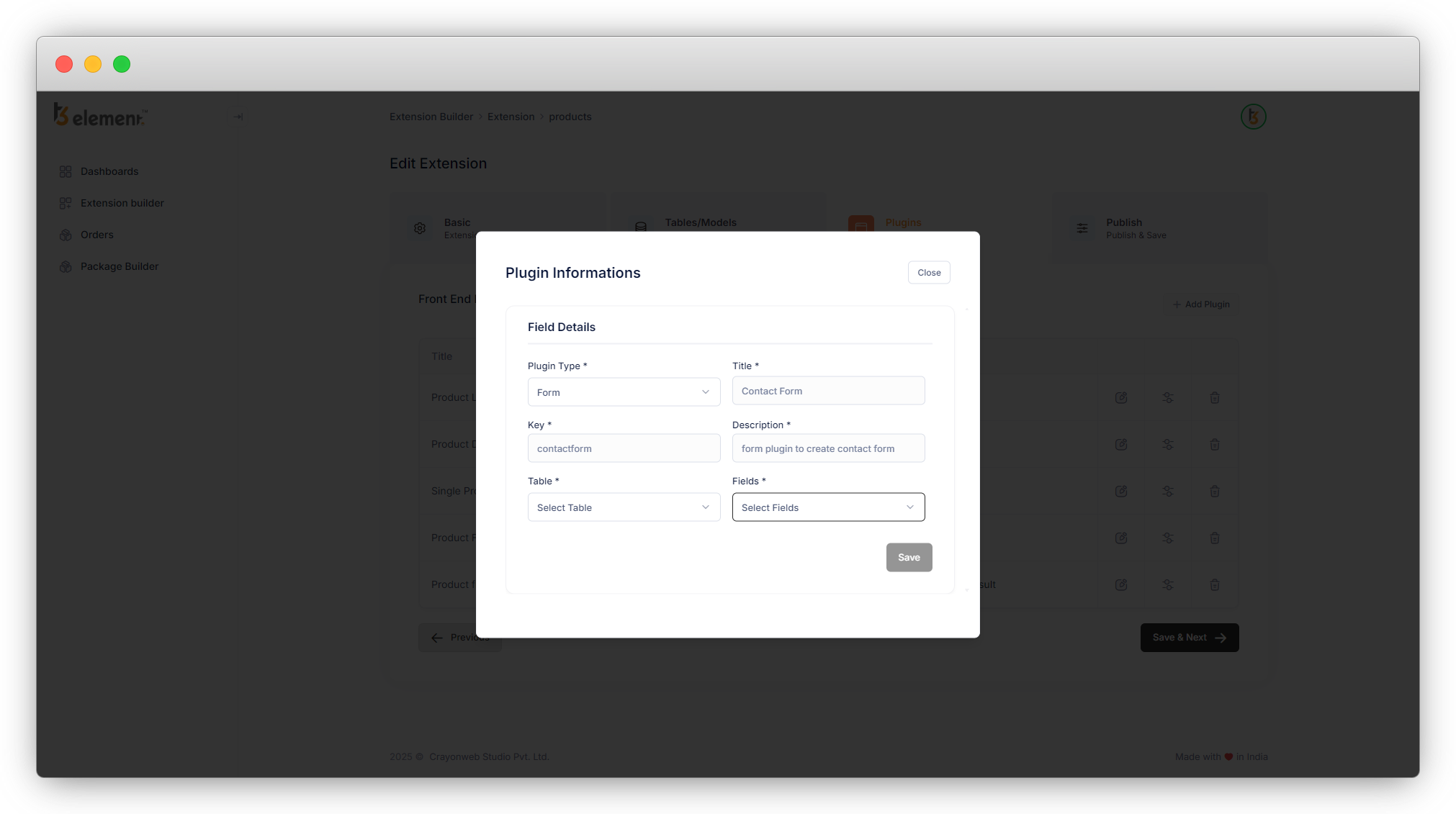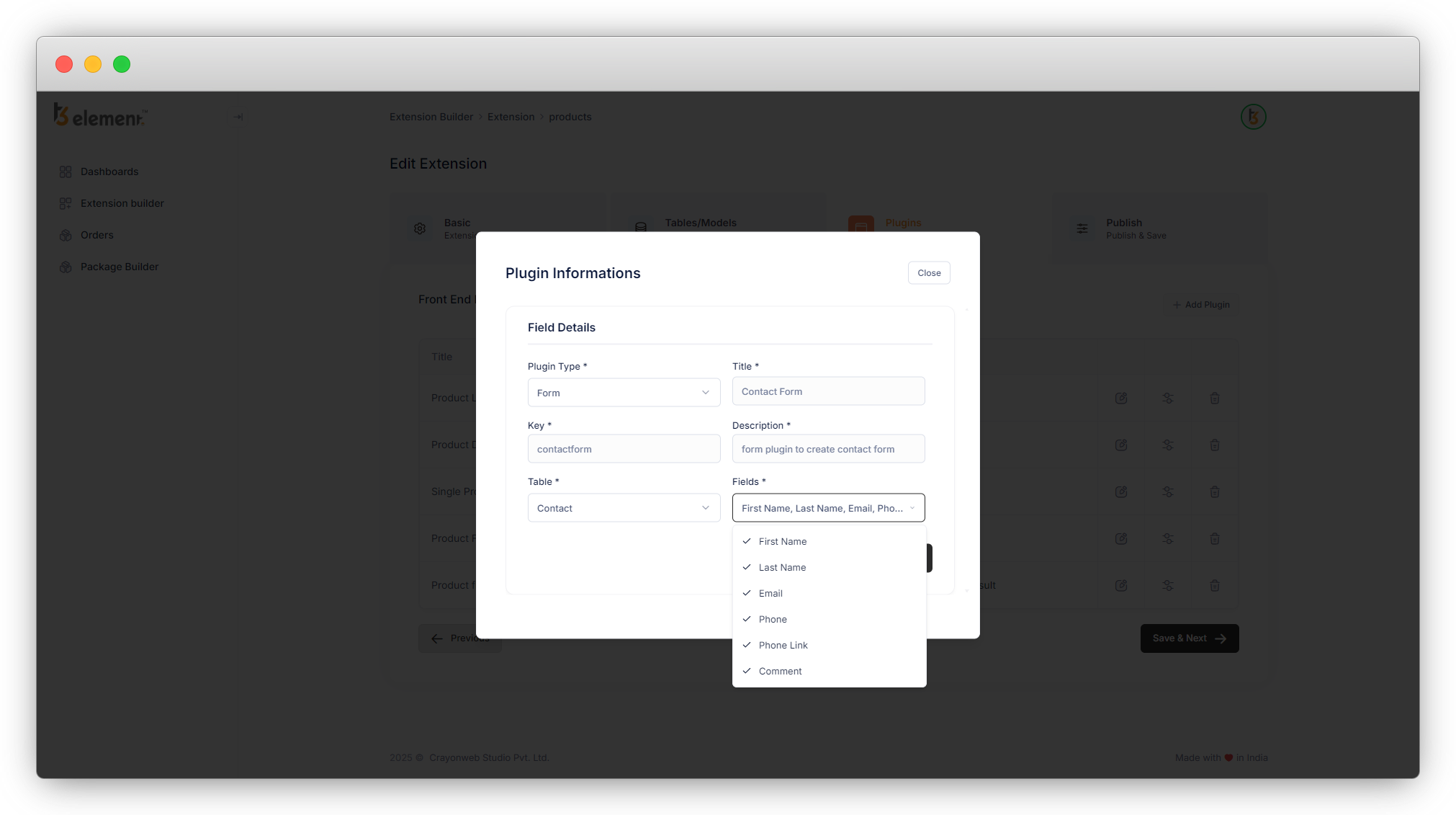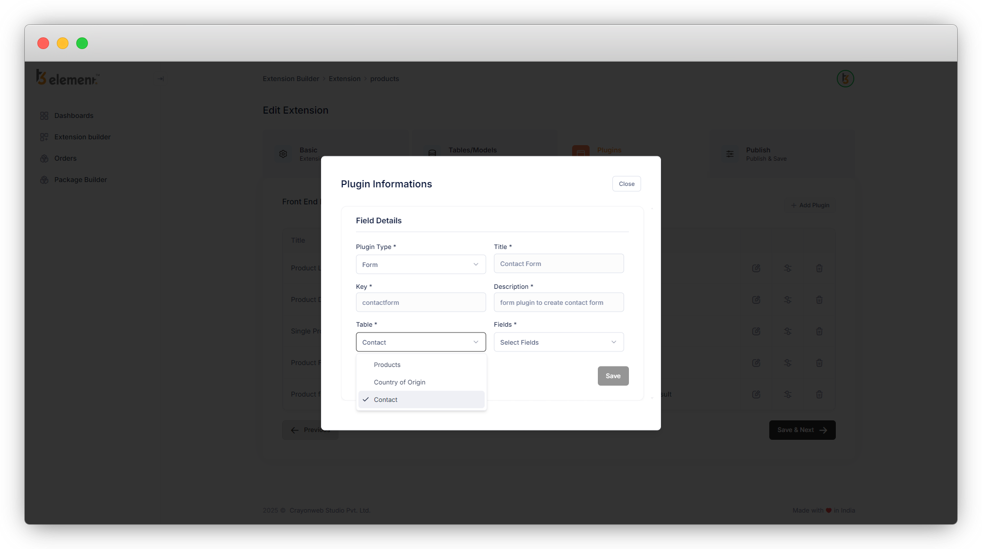 16. Now click on “Save & Next” so the “Contact Form” plugin can be saved (we already saved other plugins at the time of creating the “Contact” table). The next tab is about creating the backend modules of your tables and saving the extension.