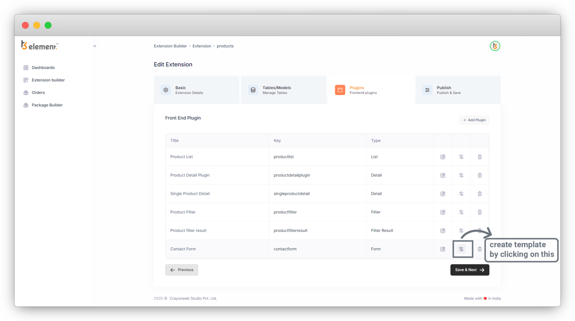 1. To create a contact form, we need to create a new table “Contact”. We need to go to the “Previous”, but before clicking on the “Previous” button, it is a must to click on the “Save & Next” button, otherwise you will lose the plugins you created.