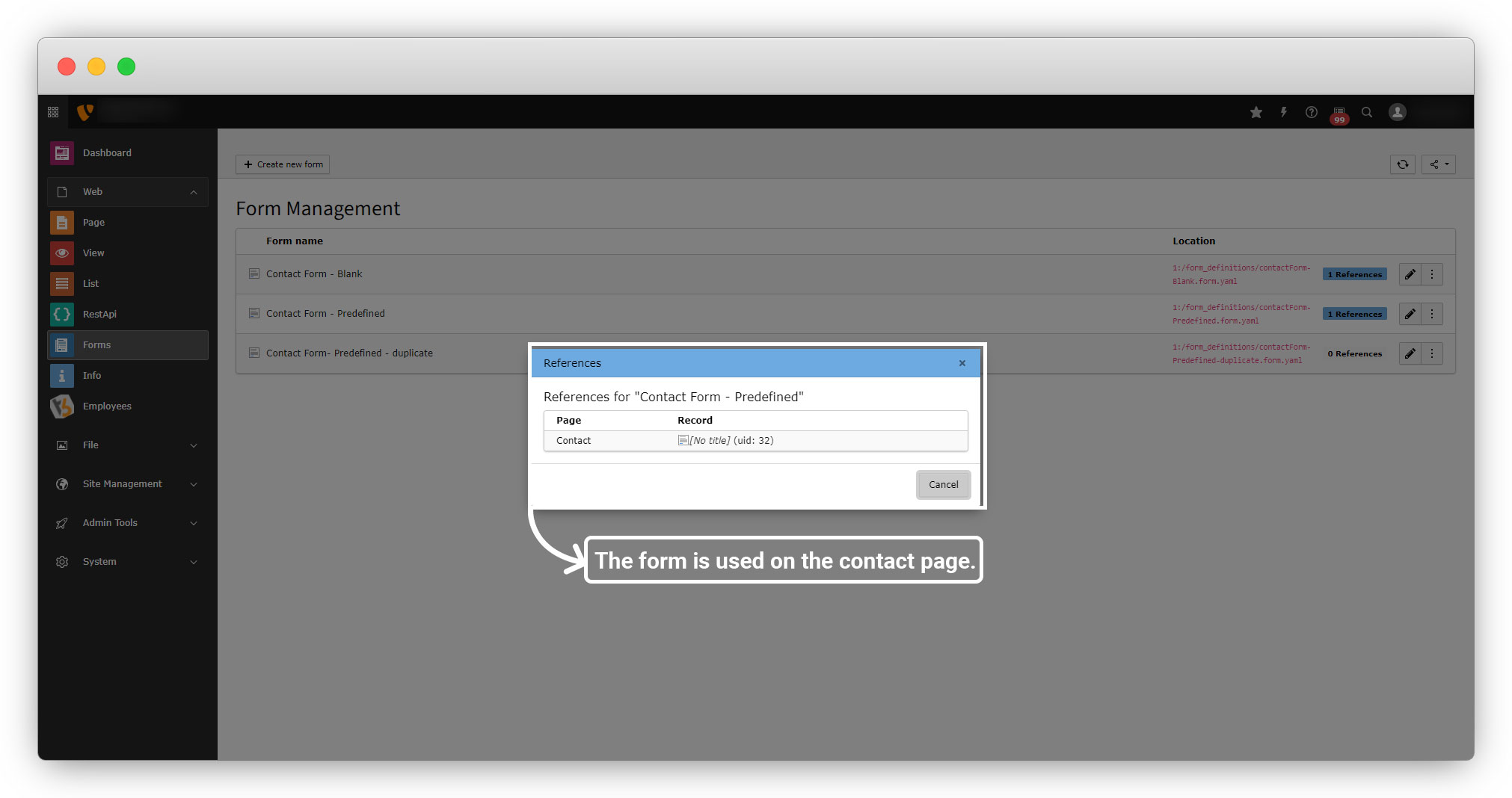 When you click on the “Show reference for this form”, you will see the popup with the list of pages where the form is added. (the screenshot is for the “Contact Form – Predifined”)
