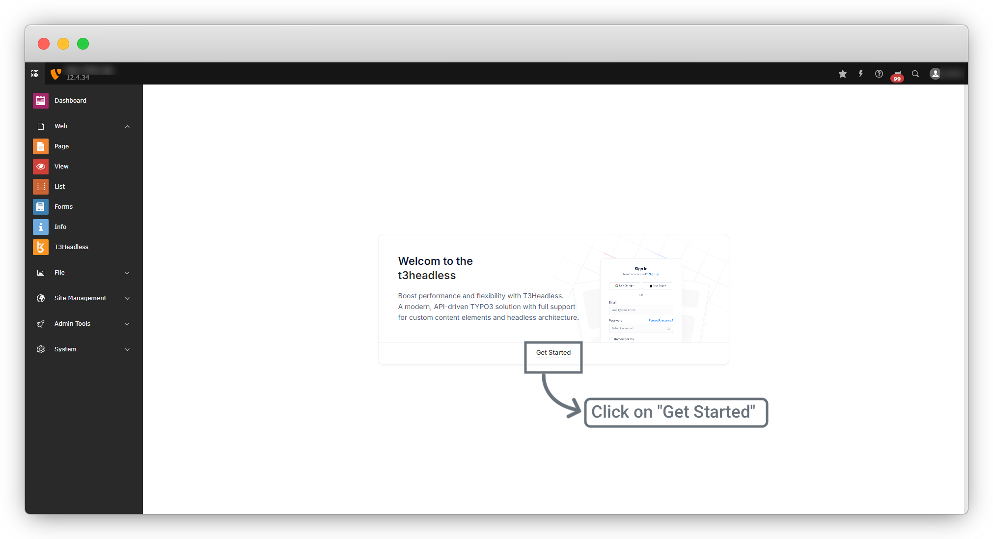 1.1. Go to Web > t3headless and you will see the screen as in the screenshot below click on “Get Started”.