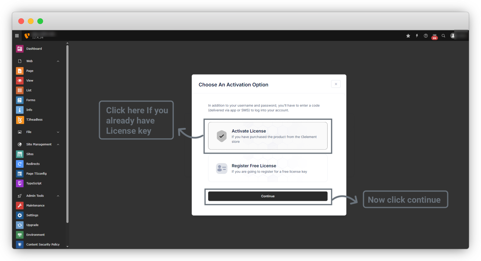 2.1. Please check your mail from T3element to find the license key, and select “Activate License” and then click on “Continue”.