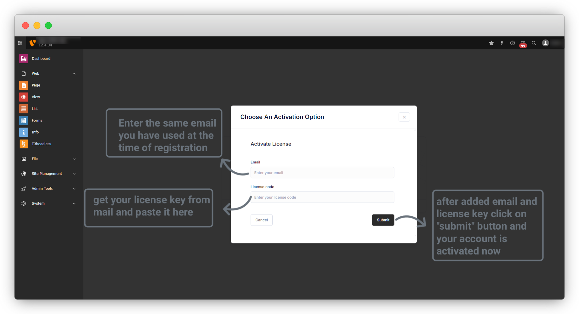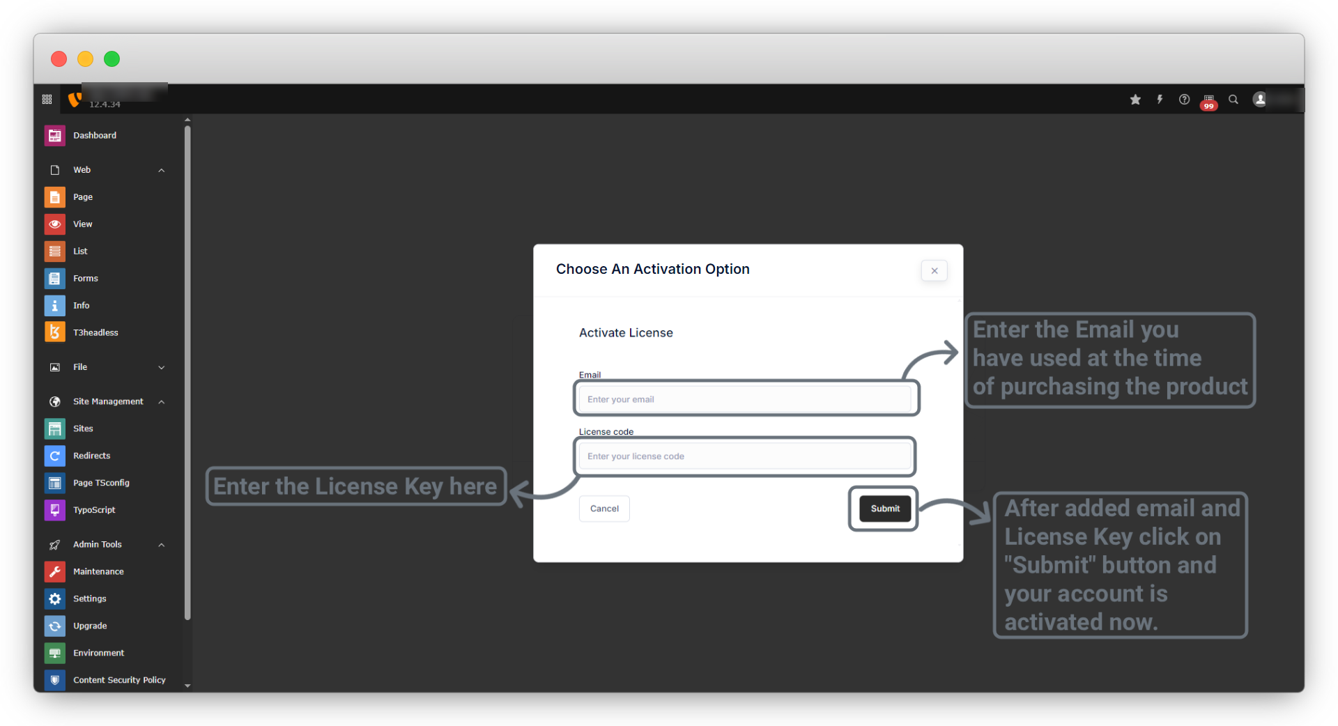 2.2. And you will see the screen as seen in the screenshot below. Now please enter your email and the license key and click on the button “Submit”.
