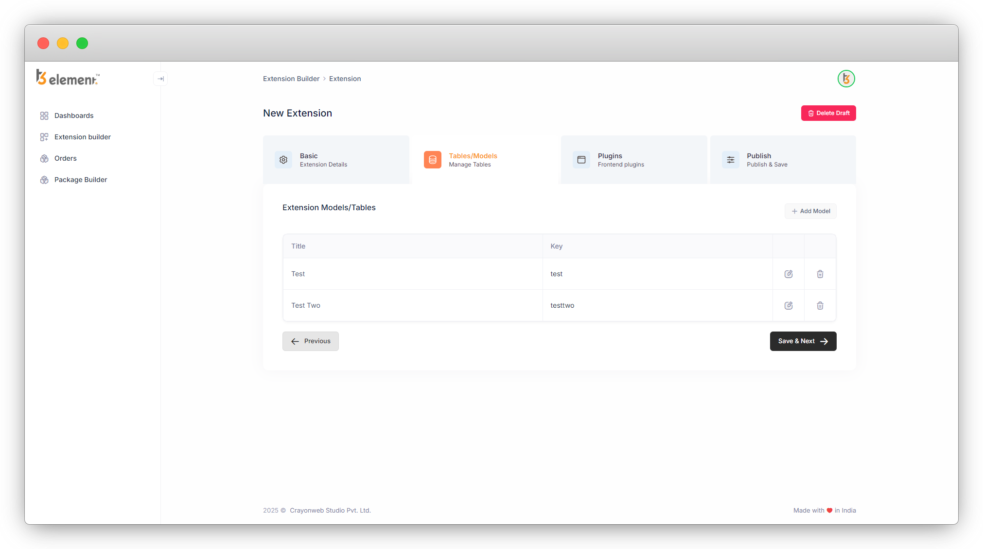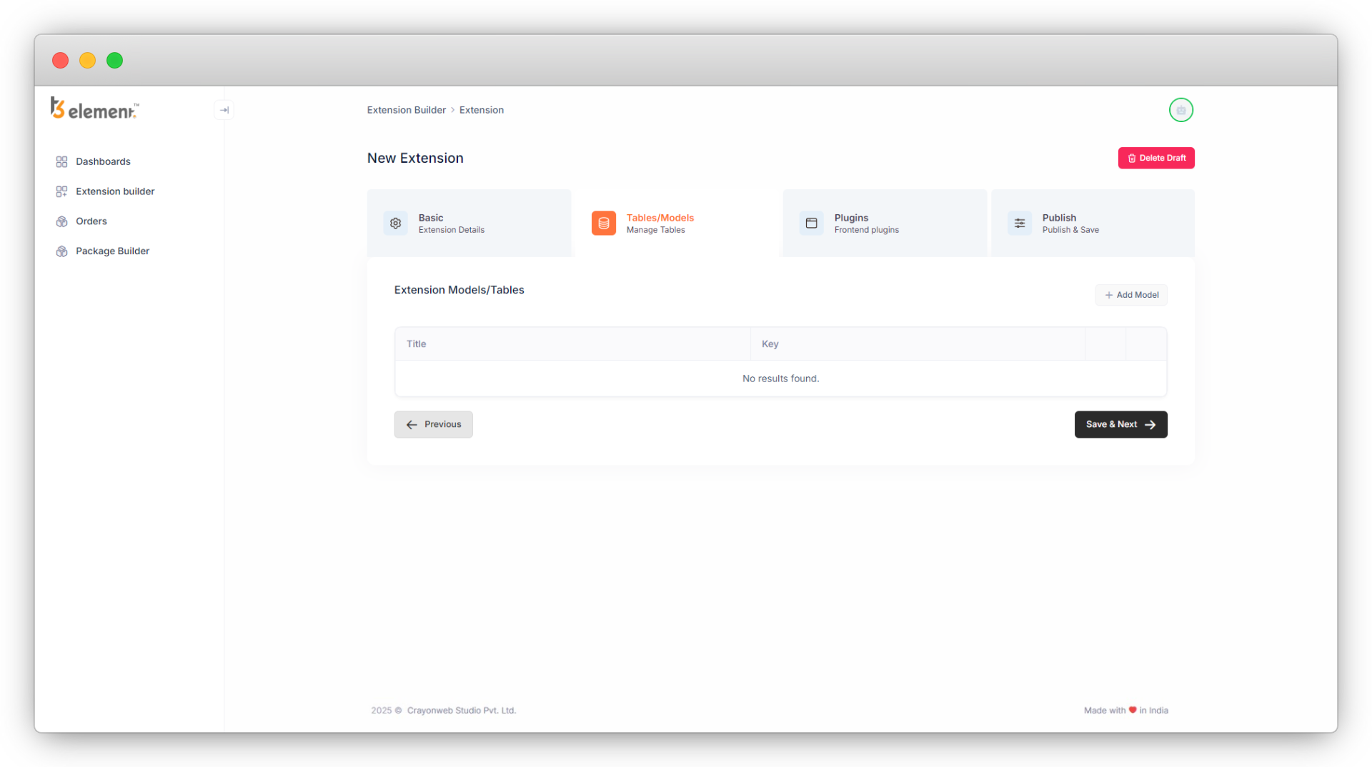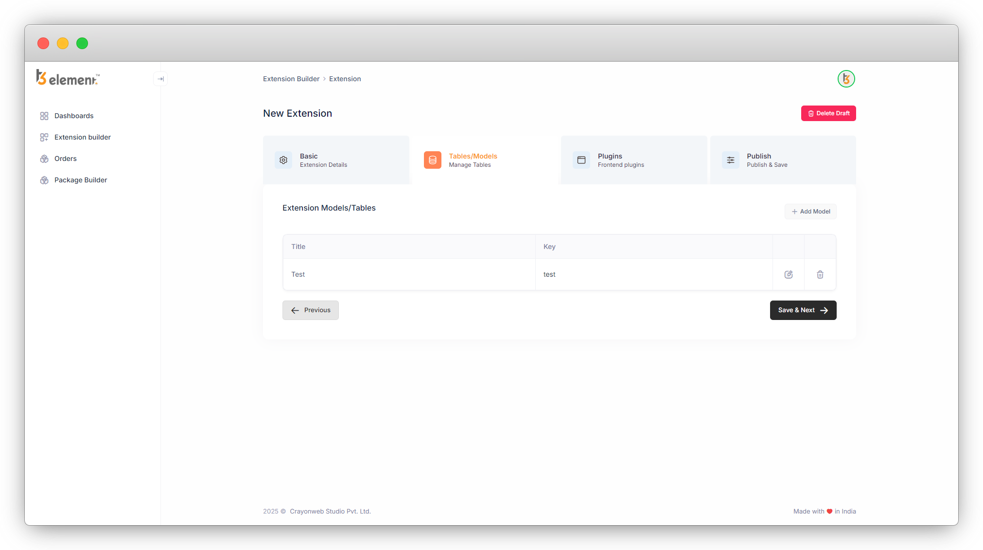 1. After filling out the extension details, the next step is to add the tables/models for the extension.
