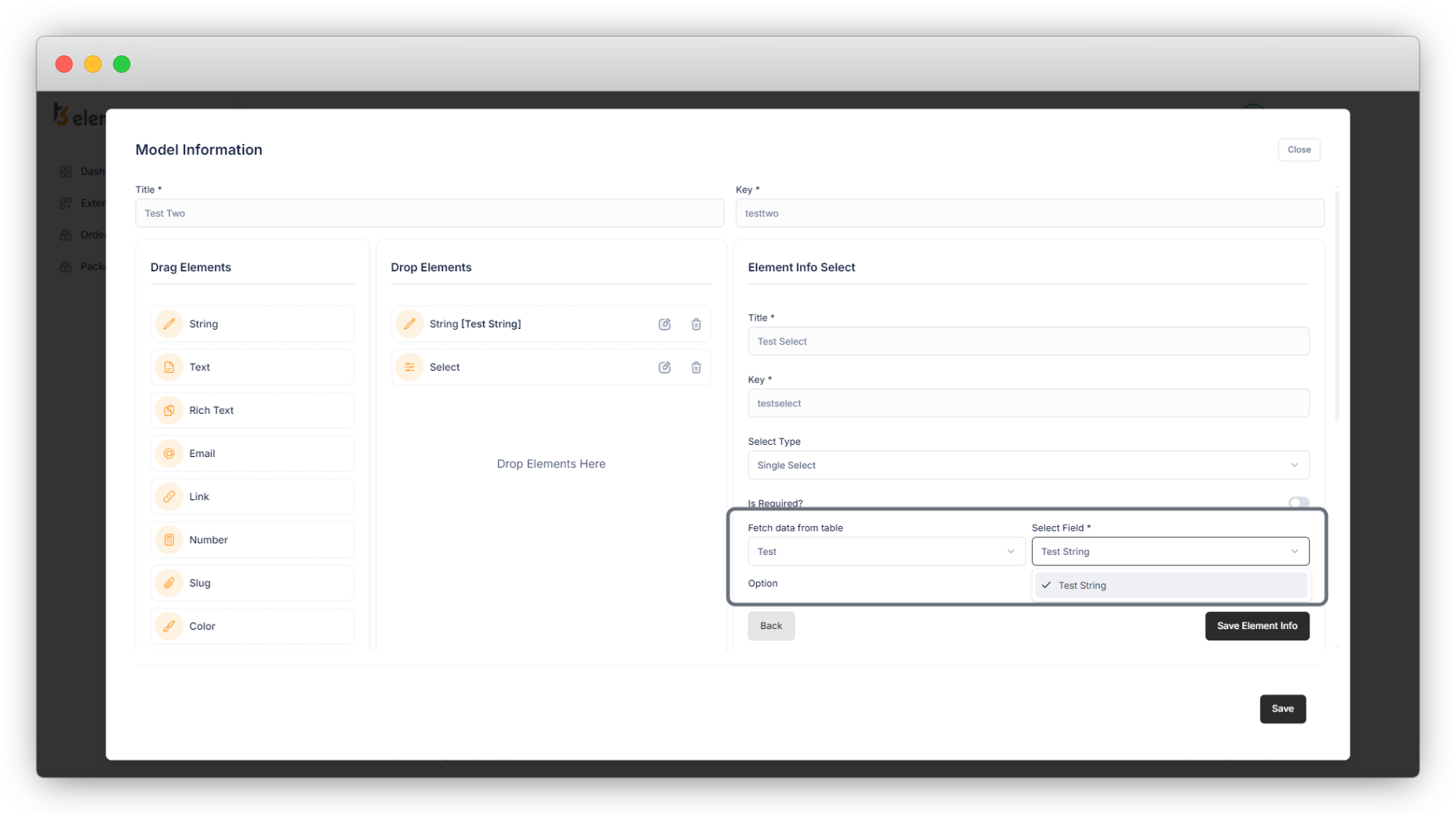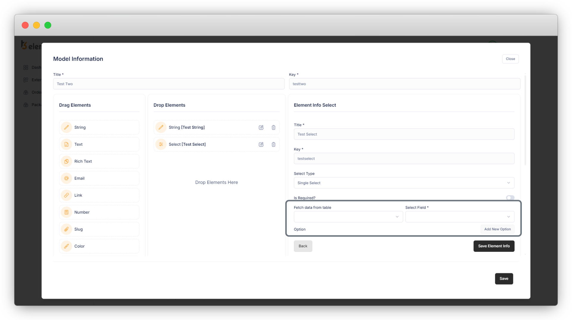 8. Fill up the form of the element with the valid data, and click on “Save Element Info”. Below is the example of creating the new table “test”. As you click on the “Add Model” button you will be able to add a new table/model, add title, key and fields for that table/model.