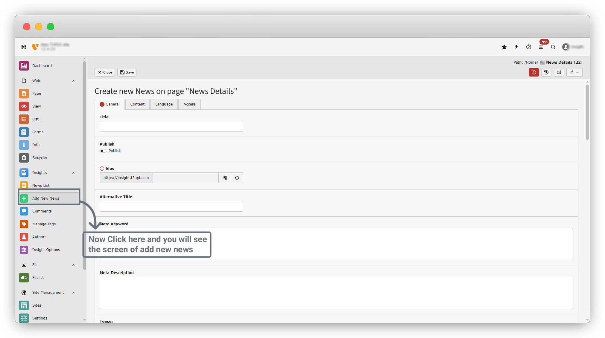 - Add New News : From the left menu, go to Insights > Add New News
