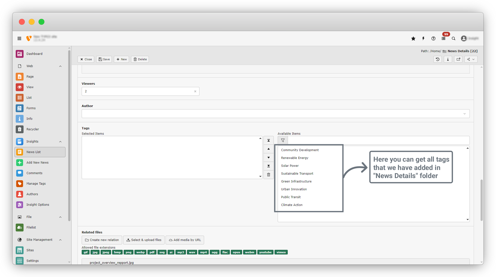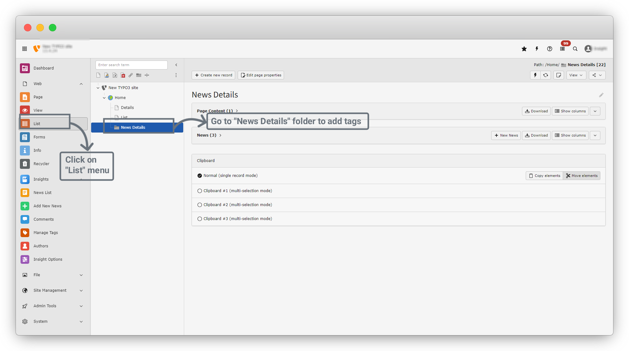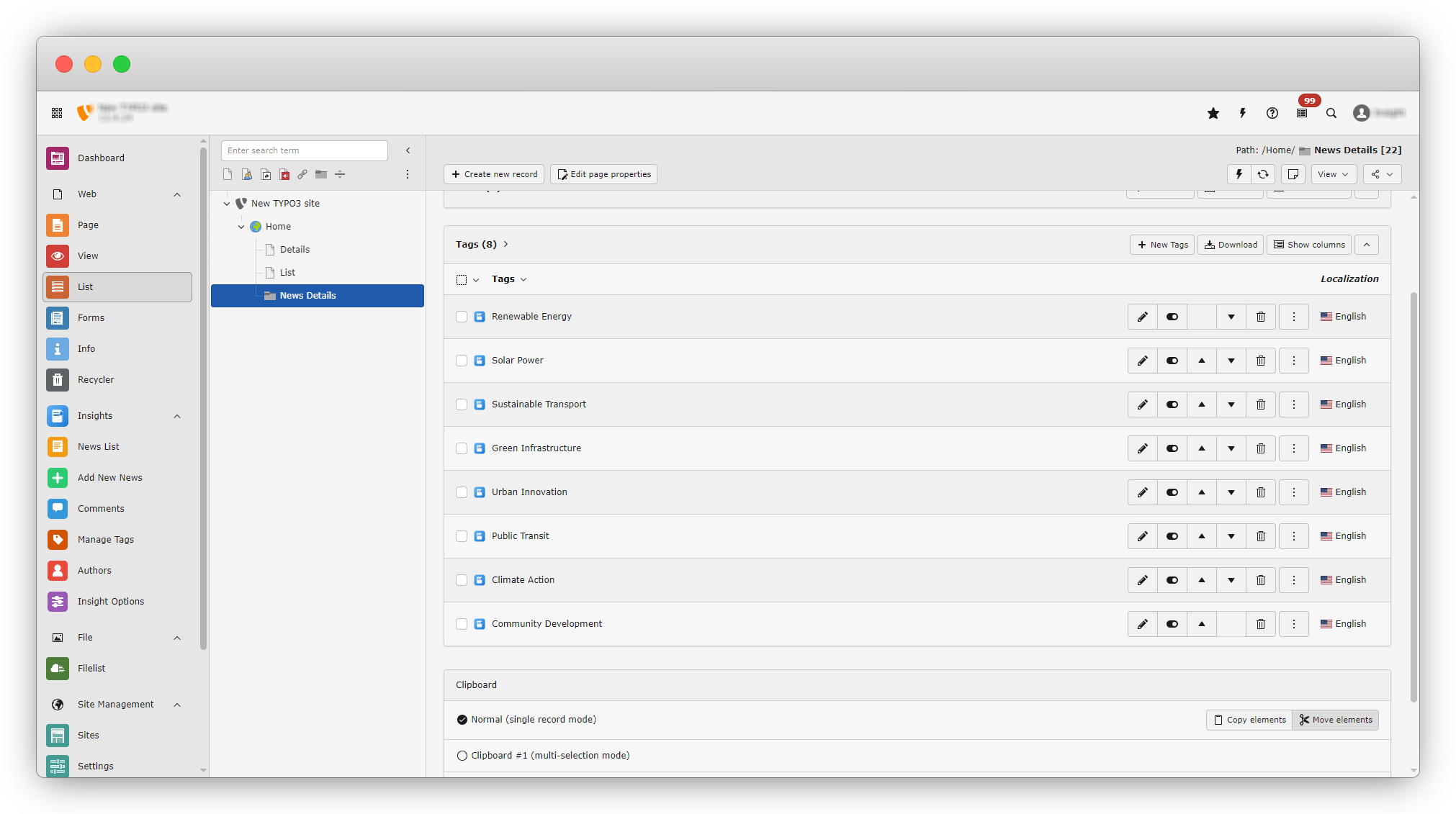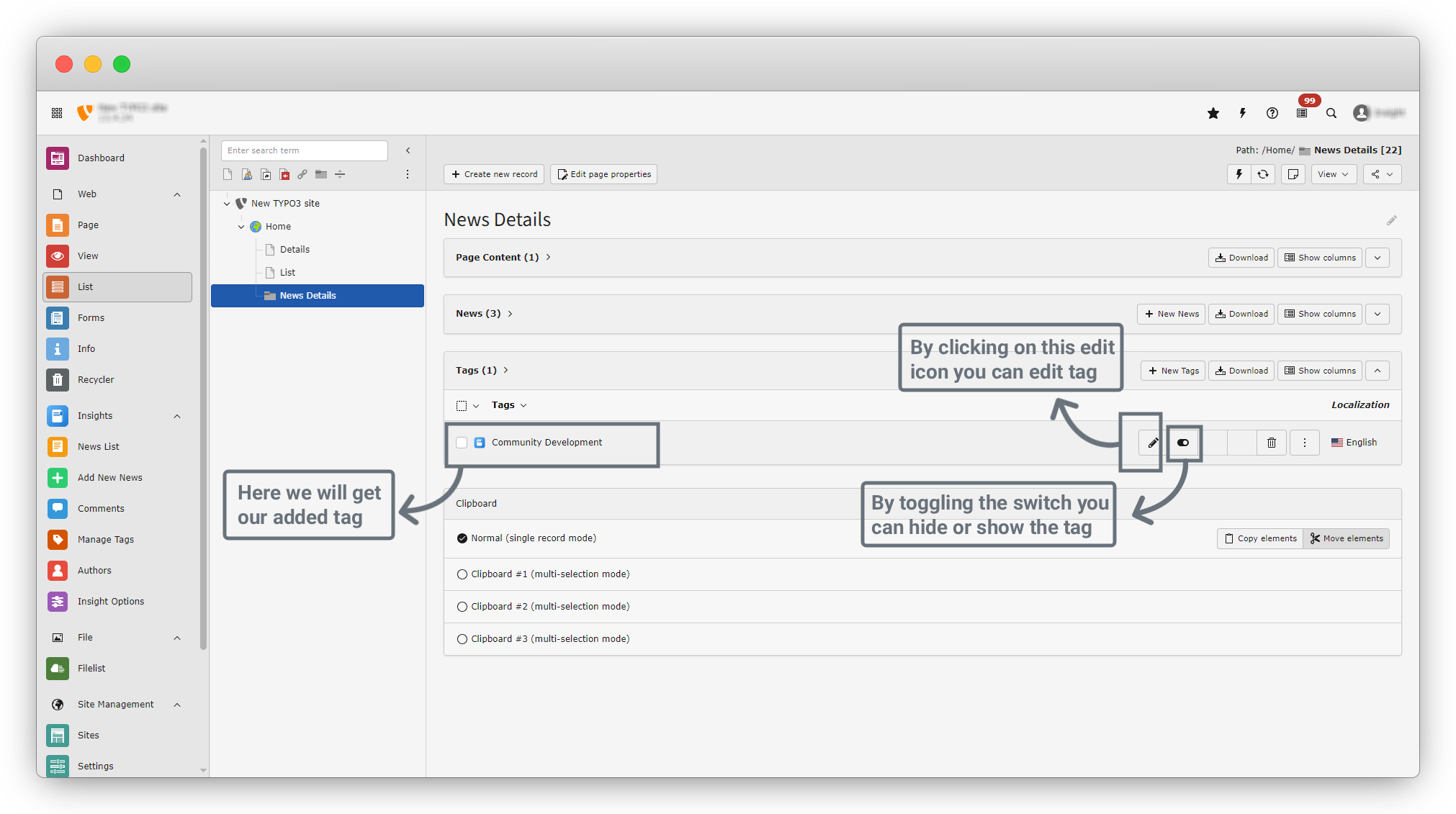 8. After closing the form, you will be redirected to the News Details folder. You will see the newly added tag listed there. The following options are available: