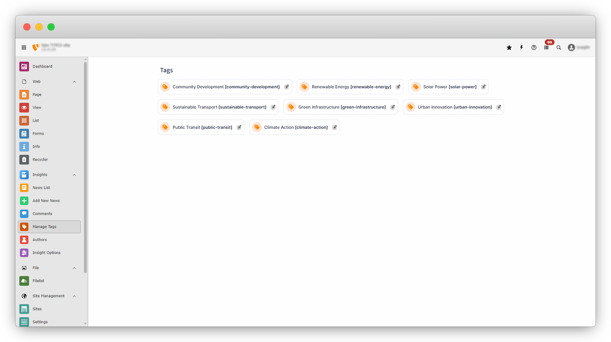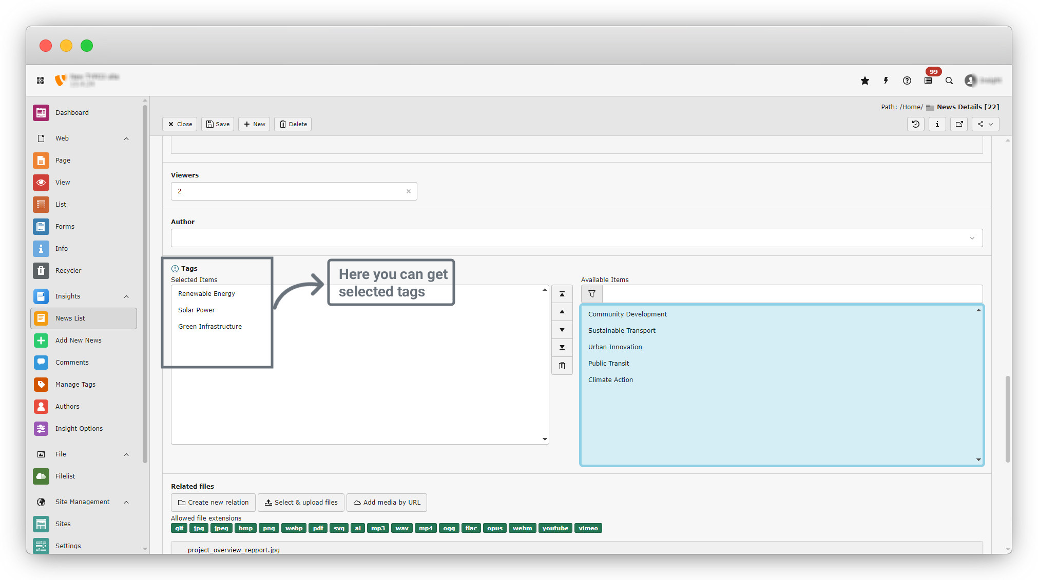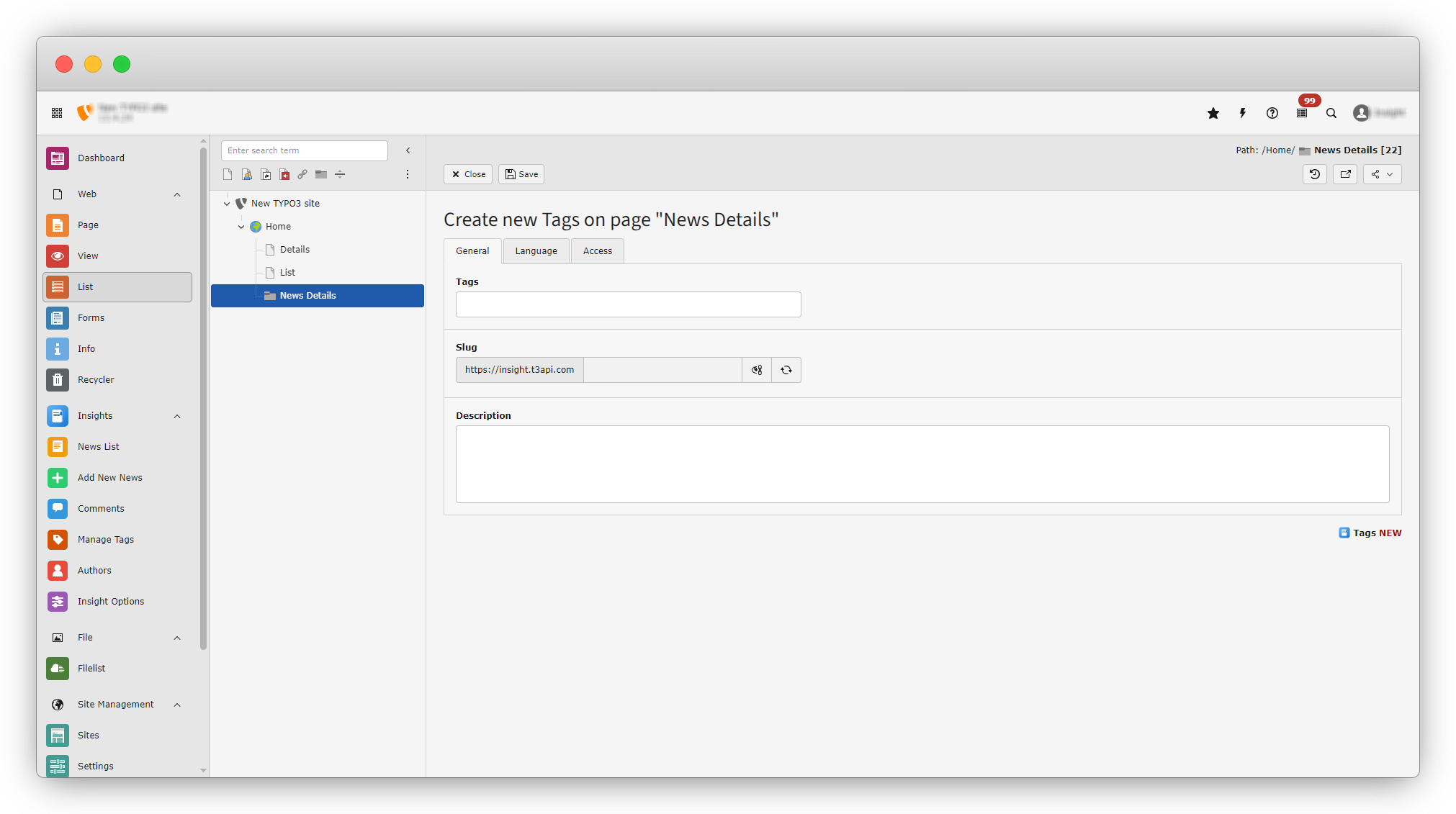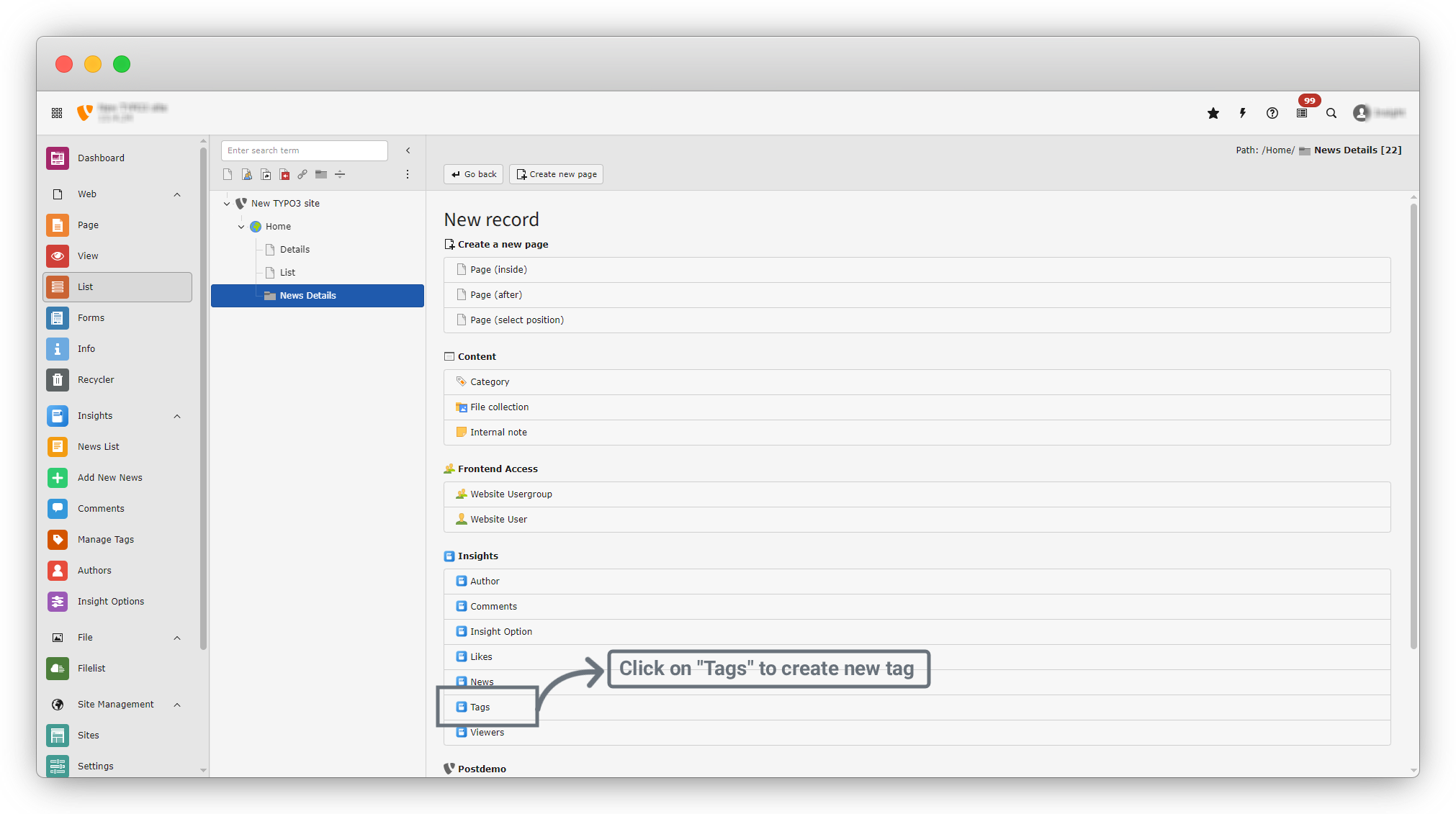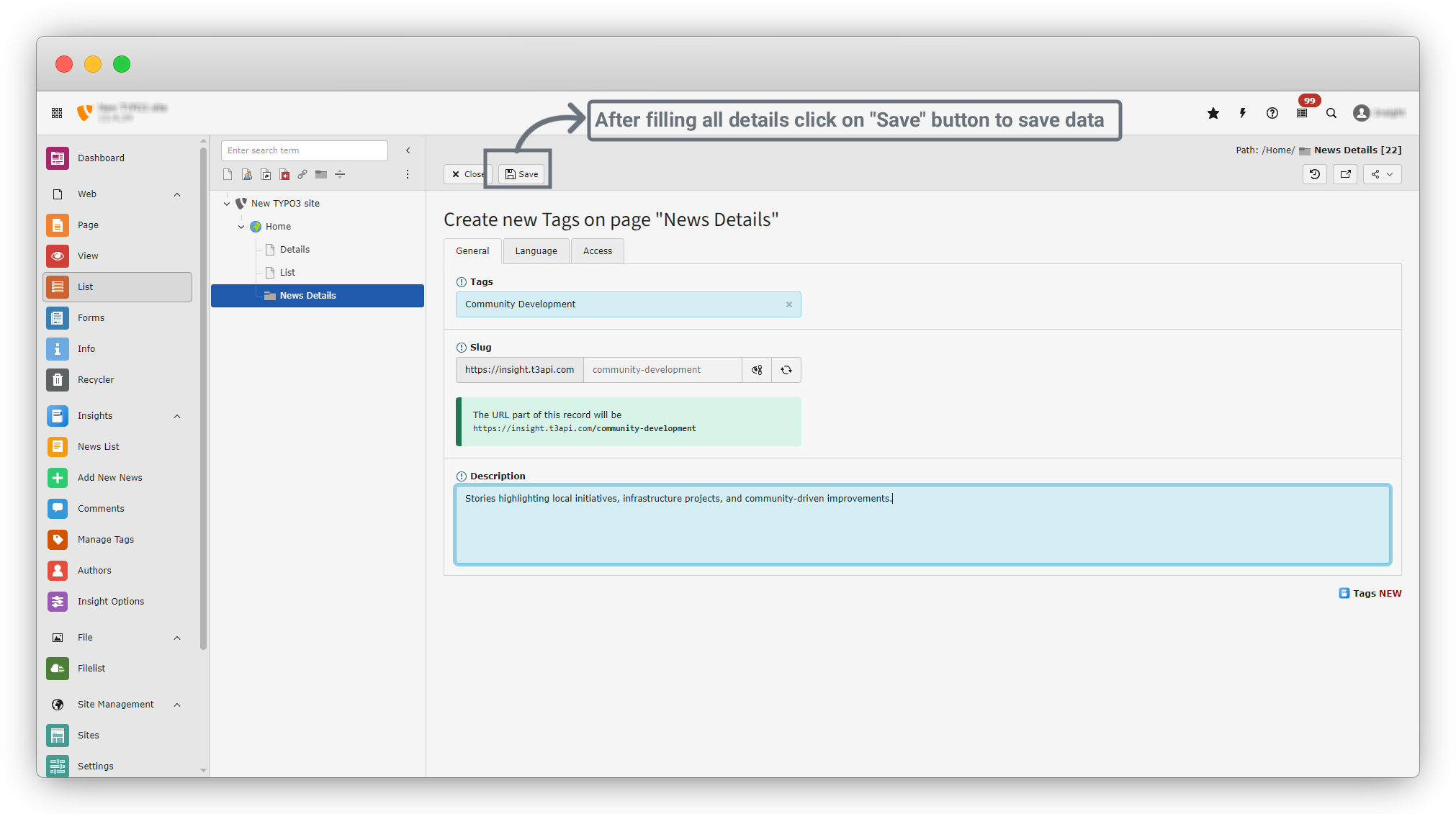 8. After closing the form, you will be redirected to the News Details folder. You will see the newly added tag listed there. The following options are available: