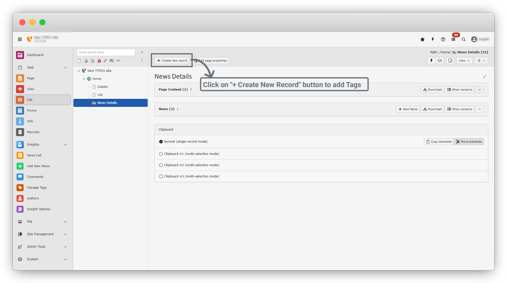2. In the News Details folder, you will see a screen like the screenshot below. Click on the “+ Create New Record” button to create a new tag.