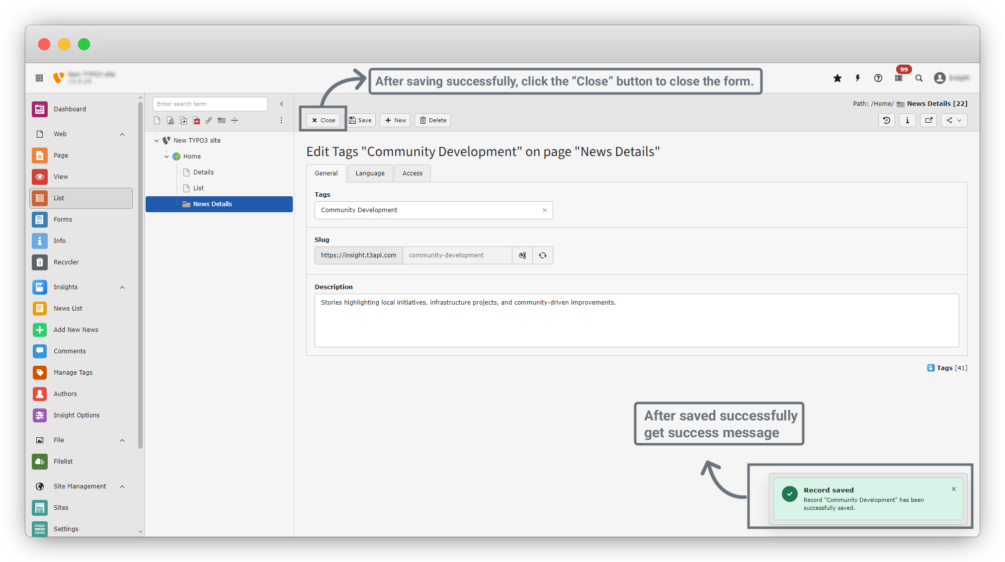 7. After saving successfully, a success message will appear as shown in the screenshot below. Click the “Close” button (next to the Save button) to close the form and return to the list.