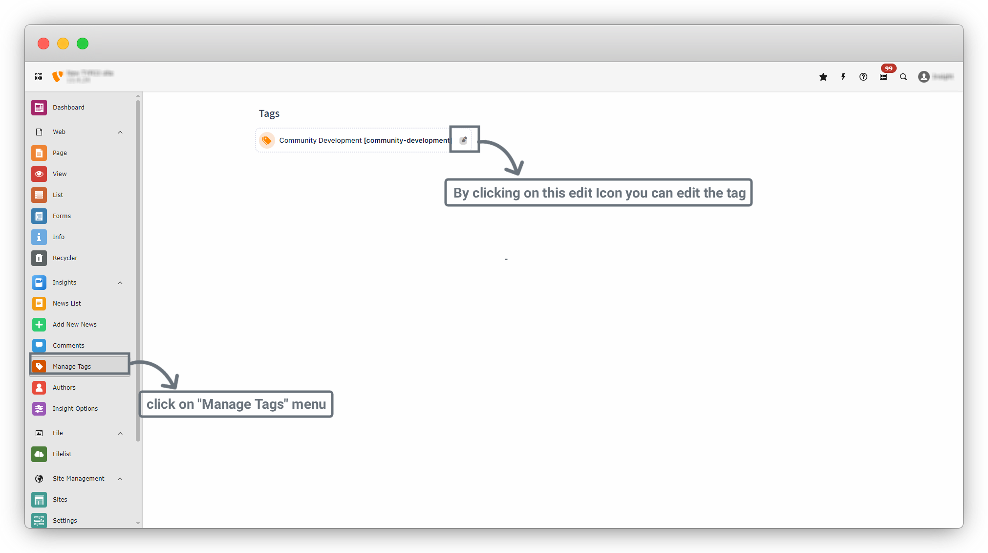 9. Now go to Insights > Manage Tags from the sidebar menu. Click on Manage Tags, and you will see a screen similar to the screenshot below. Your added tag will be listed here with an Edit icon.