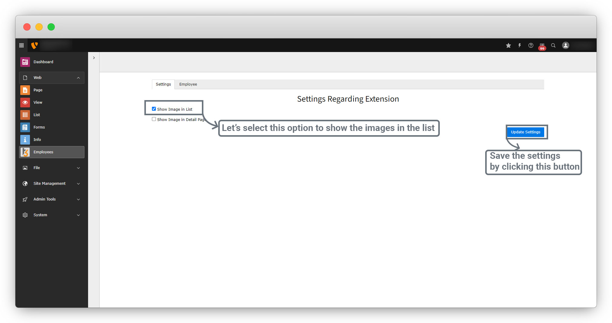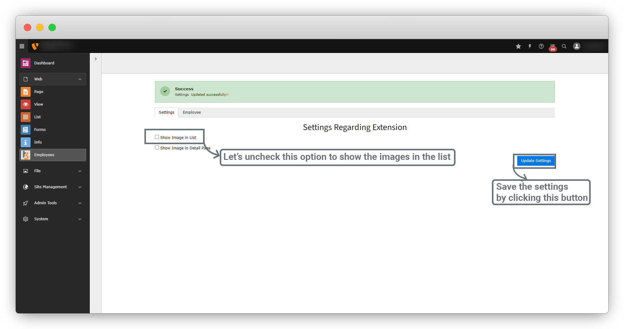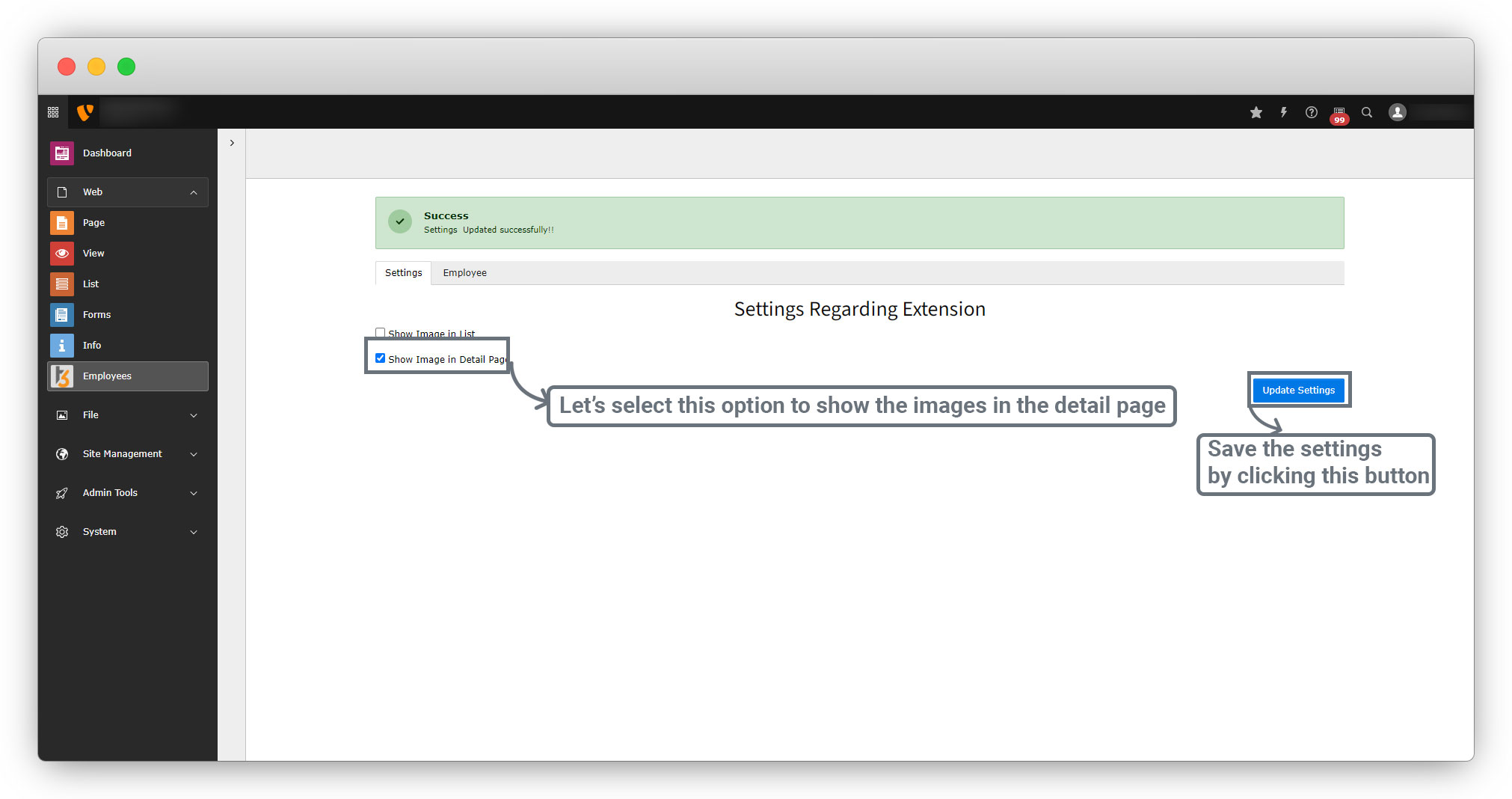 5. Let’s check same for the “Show Image in Detail Page” option. Check the option “Show Image in Detail Page” and click the button “Update Settings”.