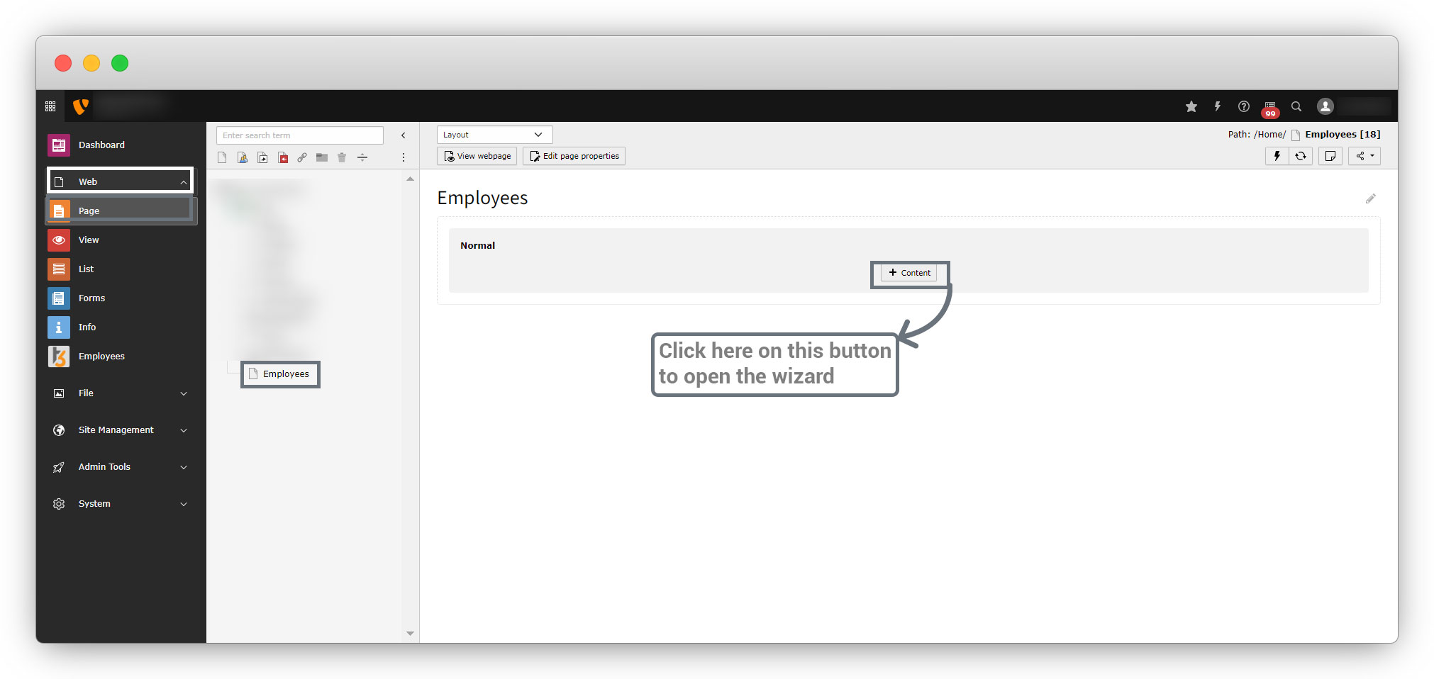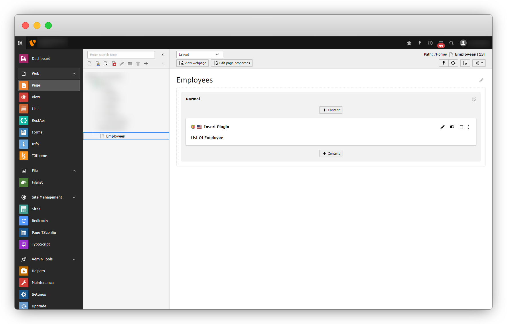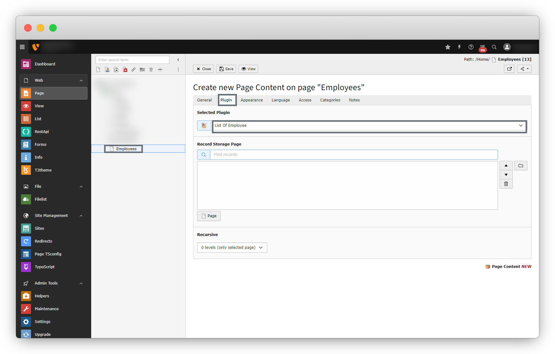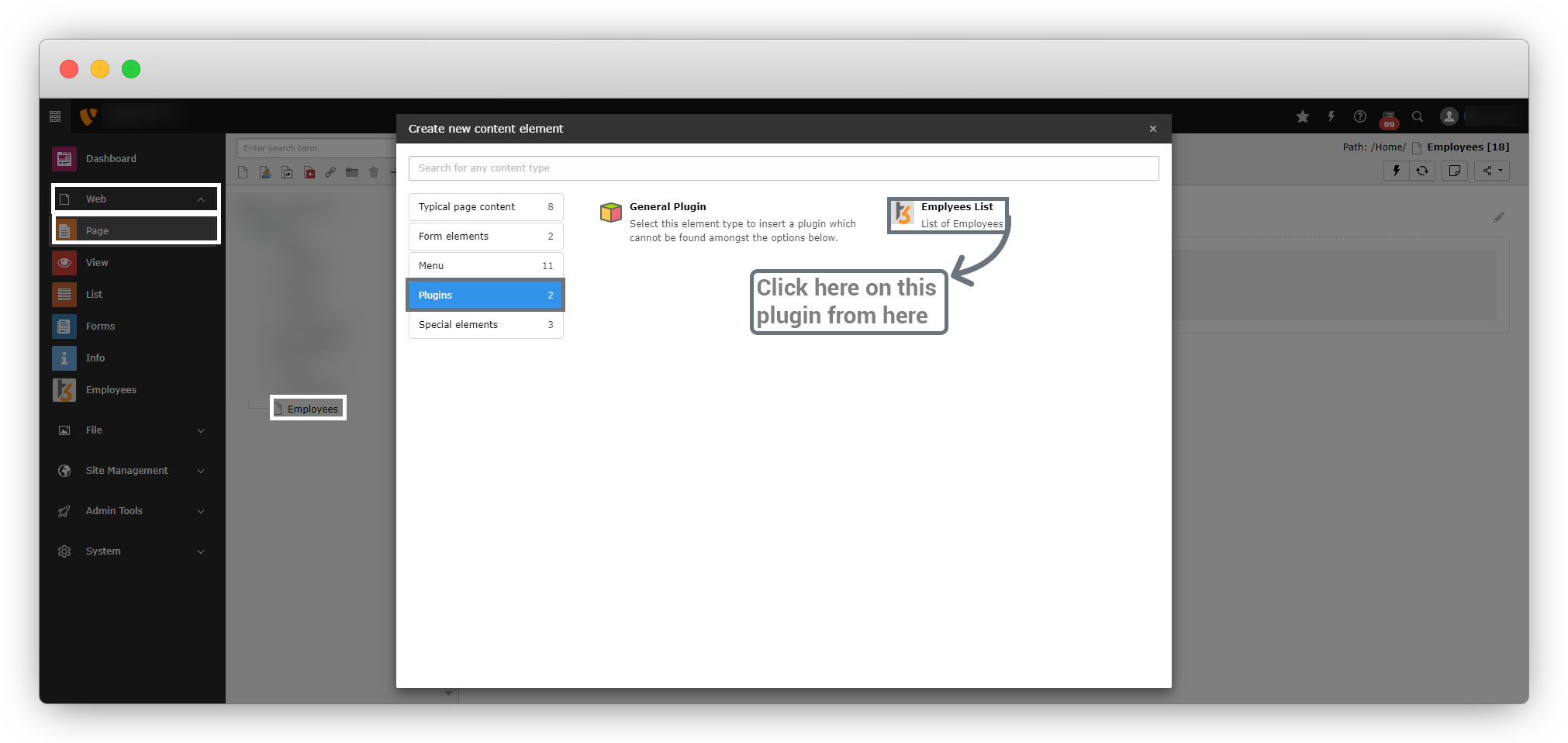 1. Go to Web > Page > Select the page you want to add the plugin to or create a new page if you want to add the plugin to the new page and click on the “+content” button, so the wizard will be open as seen in the screenshot below. Then select the “Plugins” tab and select the extension you want to use, here we want to use the “Employee List” extension we created.