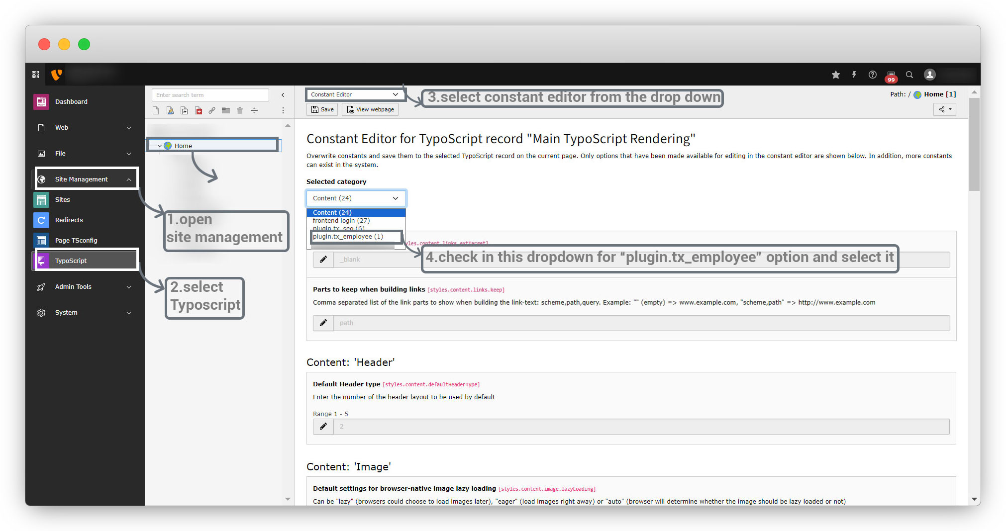 2. Typoscript files are located in <extension_directory>/Configuration/TypoScript. Here it will be employee/Configuration/TypoScript.