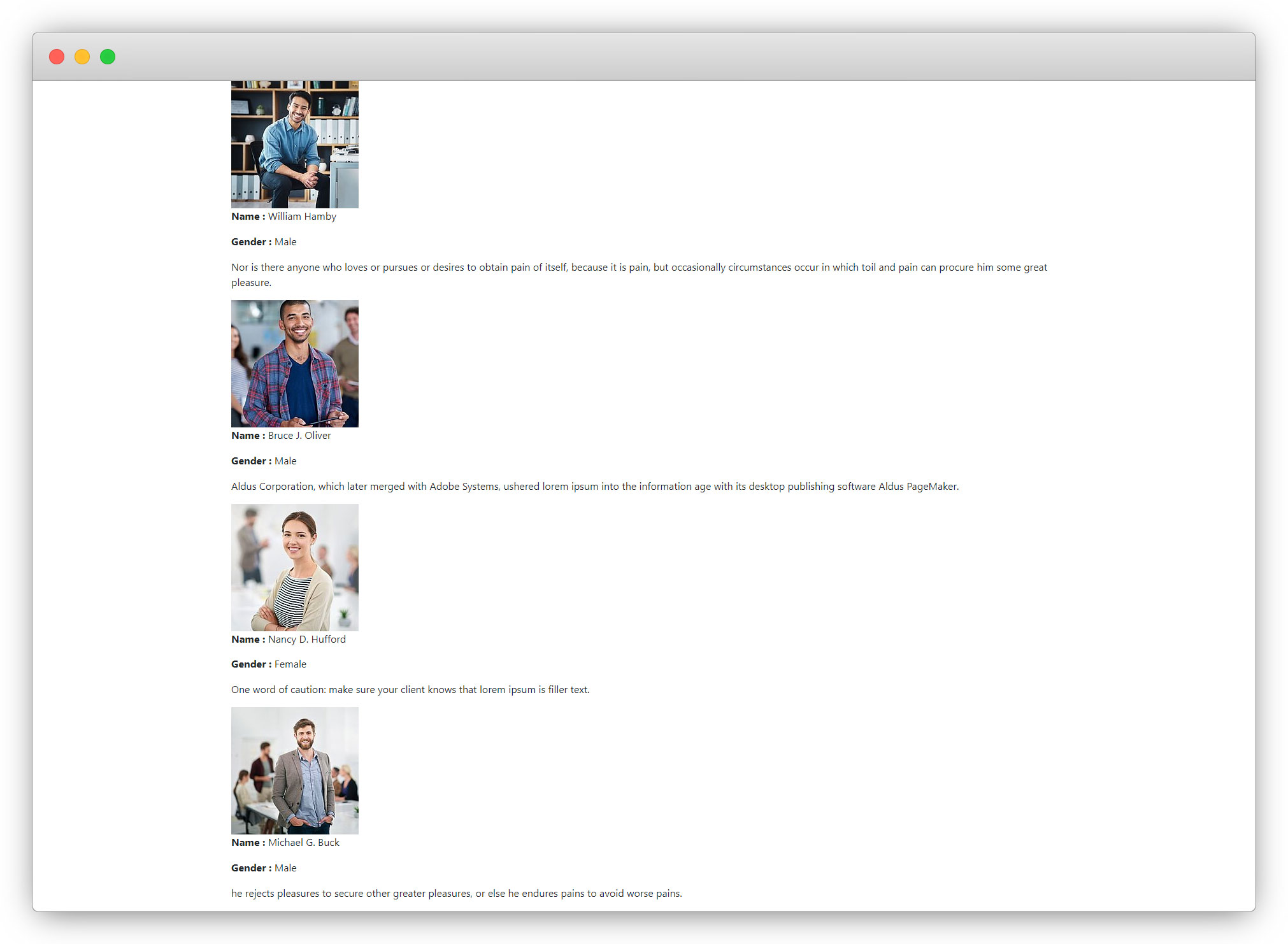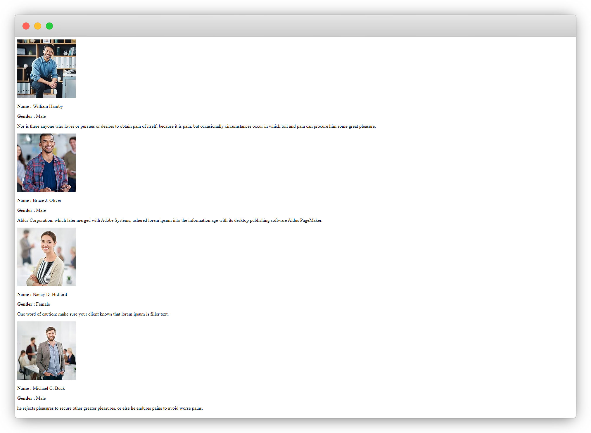 Here the dummy content and the dummy image have been used to just show the example. This is just a listing of the data we are getting that we stored in the TYPO3 admin panel. The design is required for the employee list.