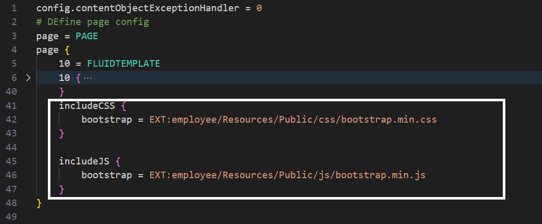 4. Let’s write the employee/Configuration/TypoScript/setup.typoscript file to render the page in the front-end.
